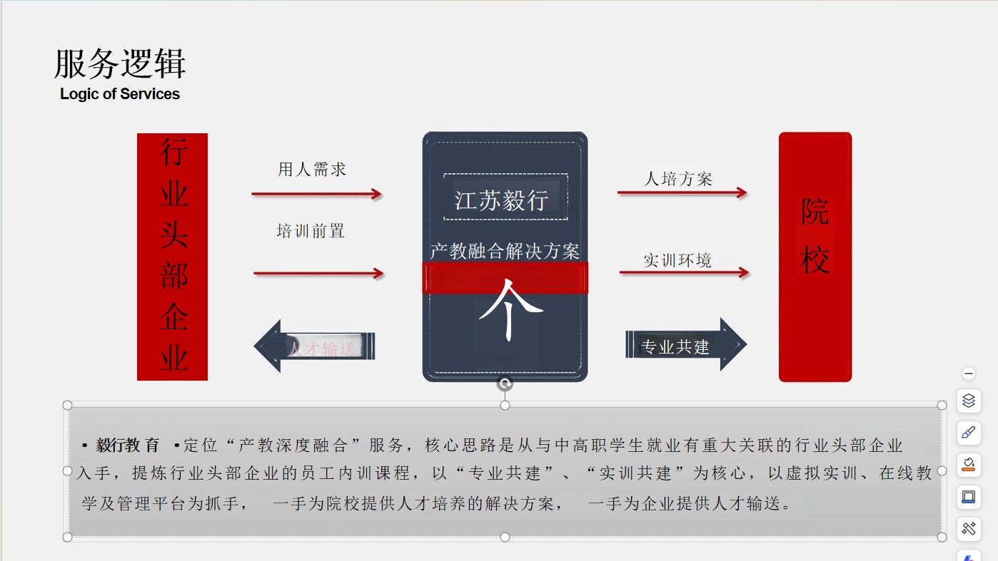 毅行教育·定位“产教深度融合”服务,核心思路是从与中高职学生就业有重大关联的行业头部企业入手,提炼行业头部企业的员工内训课程,以“专业共建”、“实训共建”为核心,以虚拟实训、在线教学及管理平台为抓手, 一手为院校提供人才培养的解决方案, 一手为企业提供人才输送。